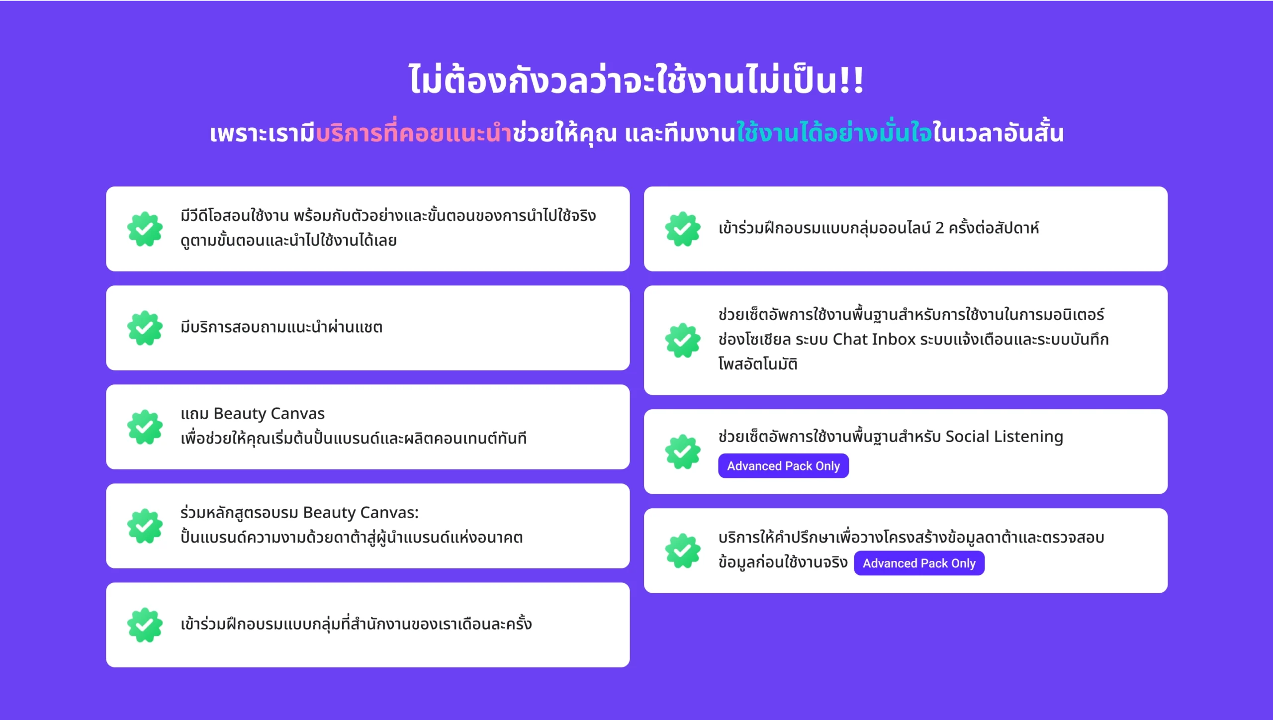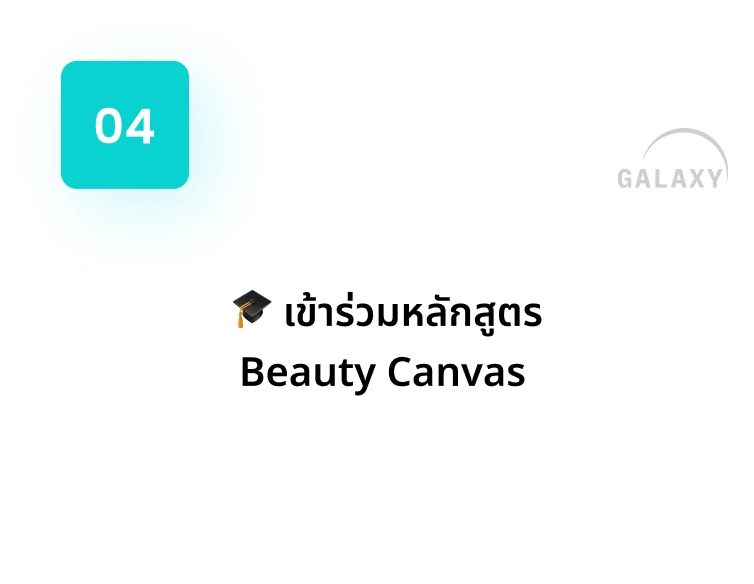 - ประโยชน์: เรียนรู้การใช้งานระบบทุกมิติ พร้อมกับข้อแนะนำในการนำ ดาต้ามาพัฒนาแบรนด์สินค้าและคลินิกความงาม เทคนิคความรู้ด้าน การบริหารจัดการด้านการตลาด การผลิตคอนเทนต์และกราฟฟิค อัพเดทเทรนด์ความงามและการต่อยอดและสร้างโอกาสใหม่ๆ สำหรับเจ้าของแบรนด์ความงาม (Beauty Canvas)