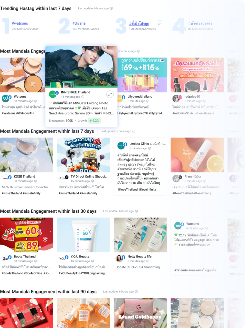 - ค้นพบข้อมูลสินค้า บริการ และเสียงสะท้อนของผู้คนในโลกออนไลน์ที่เกี่ยวกับความงาม จำนวนหลักพันล้านด้วยคีย์เวิดท์ที่ทีมงานของเราทำการสกัด มอนิเตอร์ ปรับแต่งและเพิ่มอยู่เสมอ โดยทางเราจะทำการมอนิเตอร์และเติมแบรน์ทุกวัน