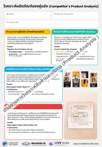 - Product Analysis (การวิเคราะห์สินค้าและบริการ): วิเคราะห์จุดแข็ง จุดอ่อน และตำแหน่งทางการตลาดของคู่แข่งอย่างเป็นระบบ มองเห็นโอกาสขึ้นเป็นผู้นำในตลาดได้!